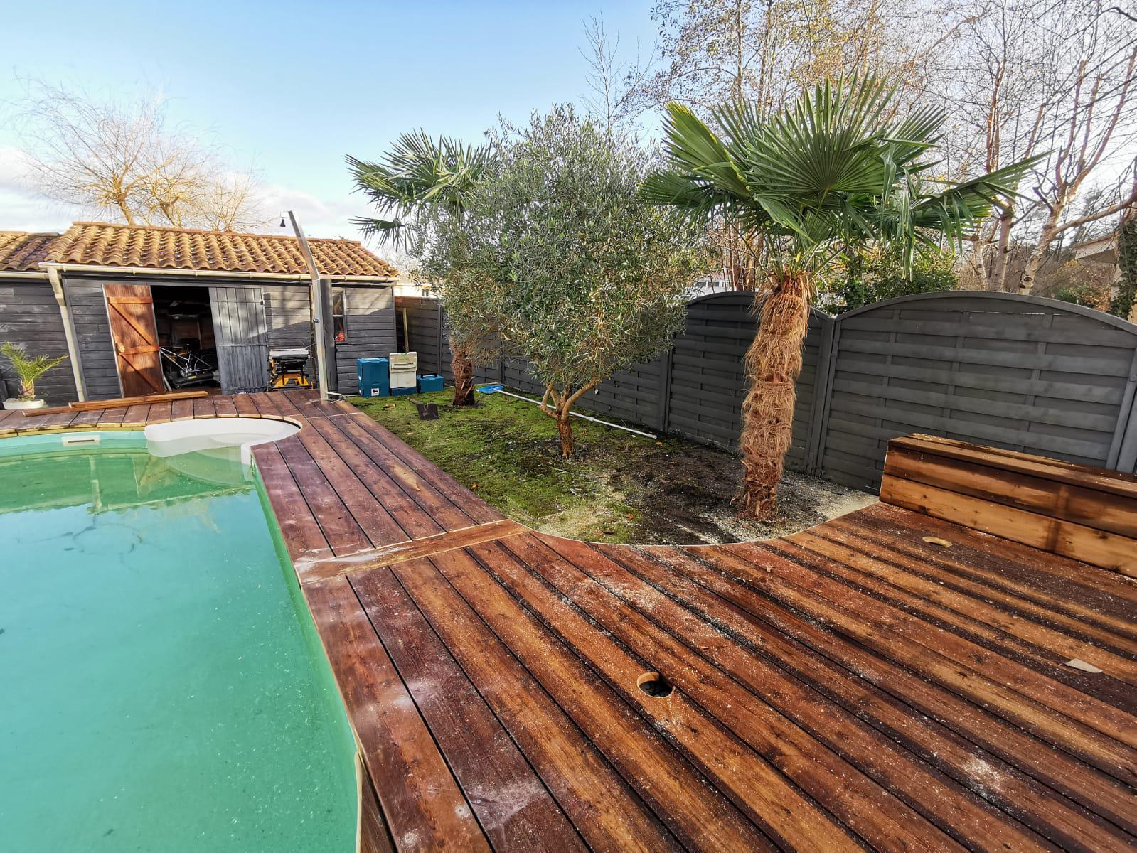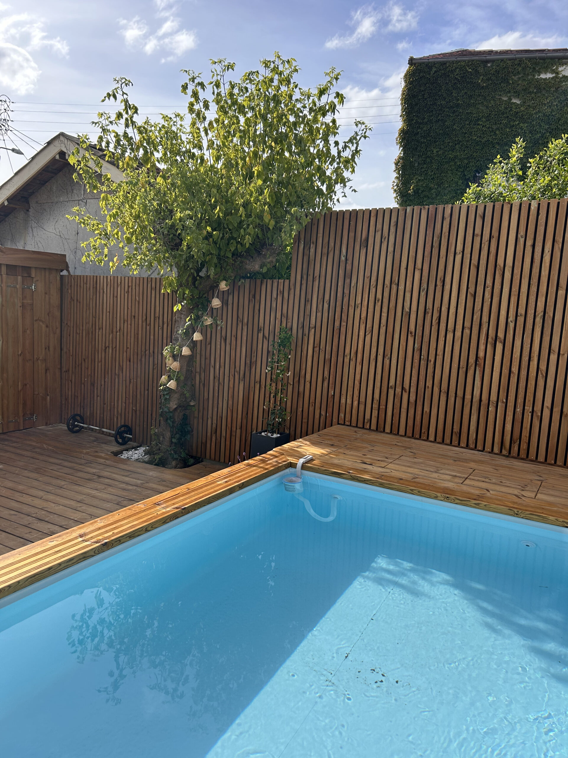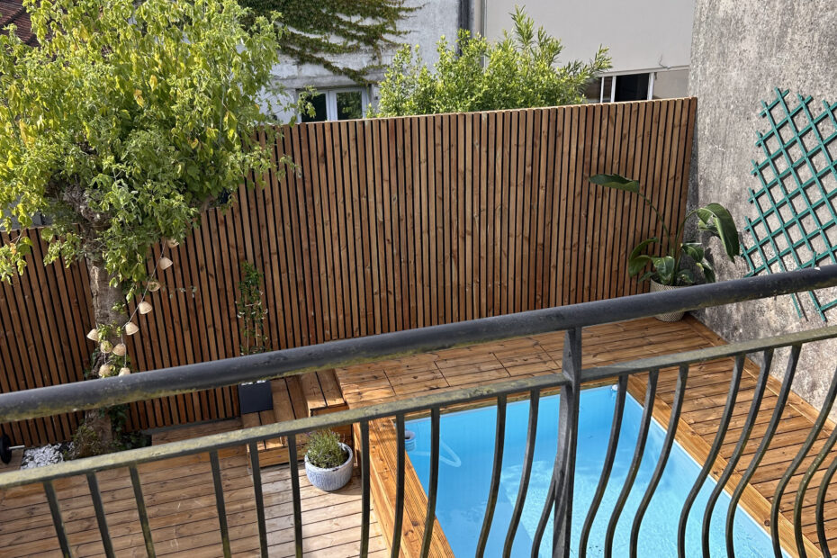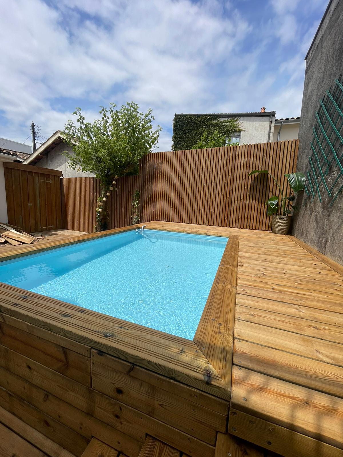 En ville, réalisation d'un petit cocon : terrasse pensée autour de la piscine, cabanon et clairevoie - Talence 33