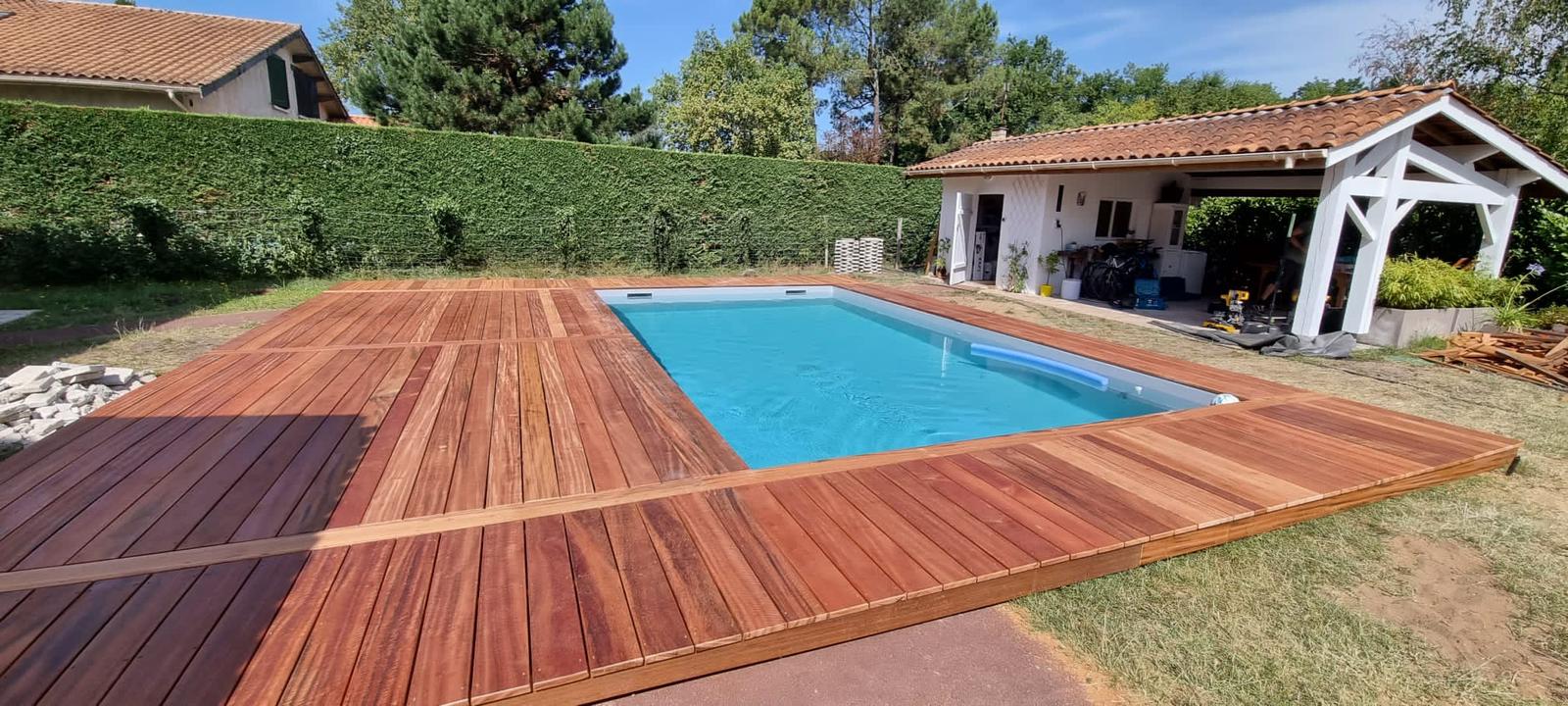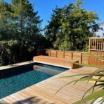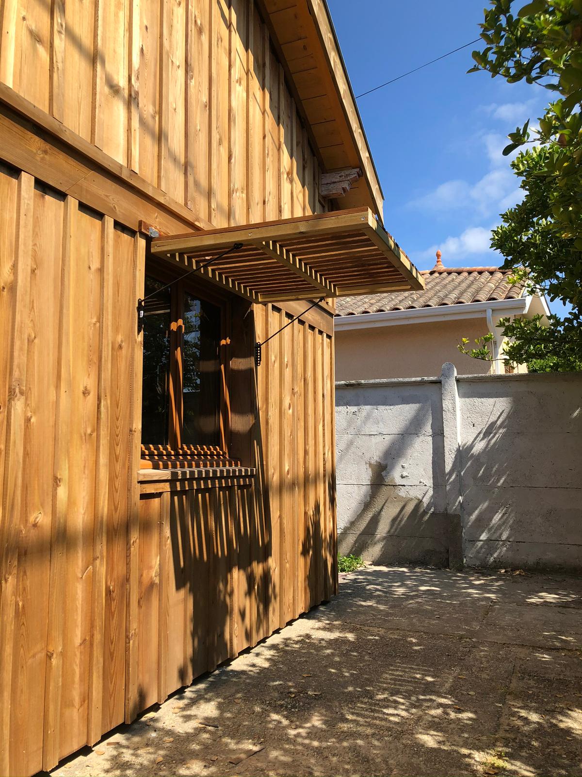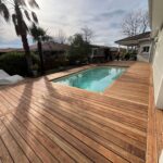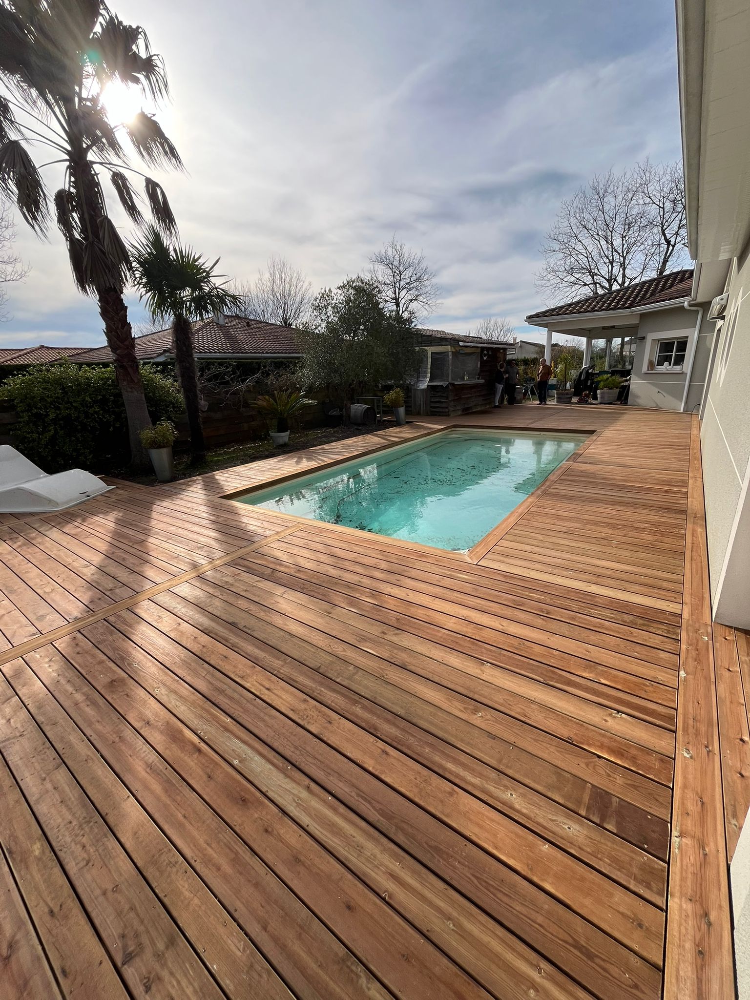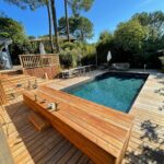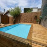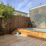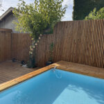 En ville, réalisation d'un petit cocon : terrasse pensée autour de la piscine, cabanon et clairevoie - Talence 33