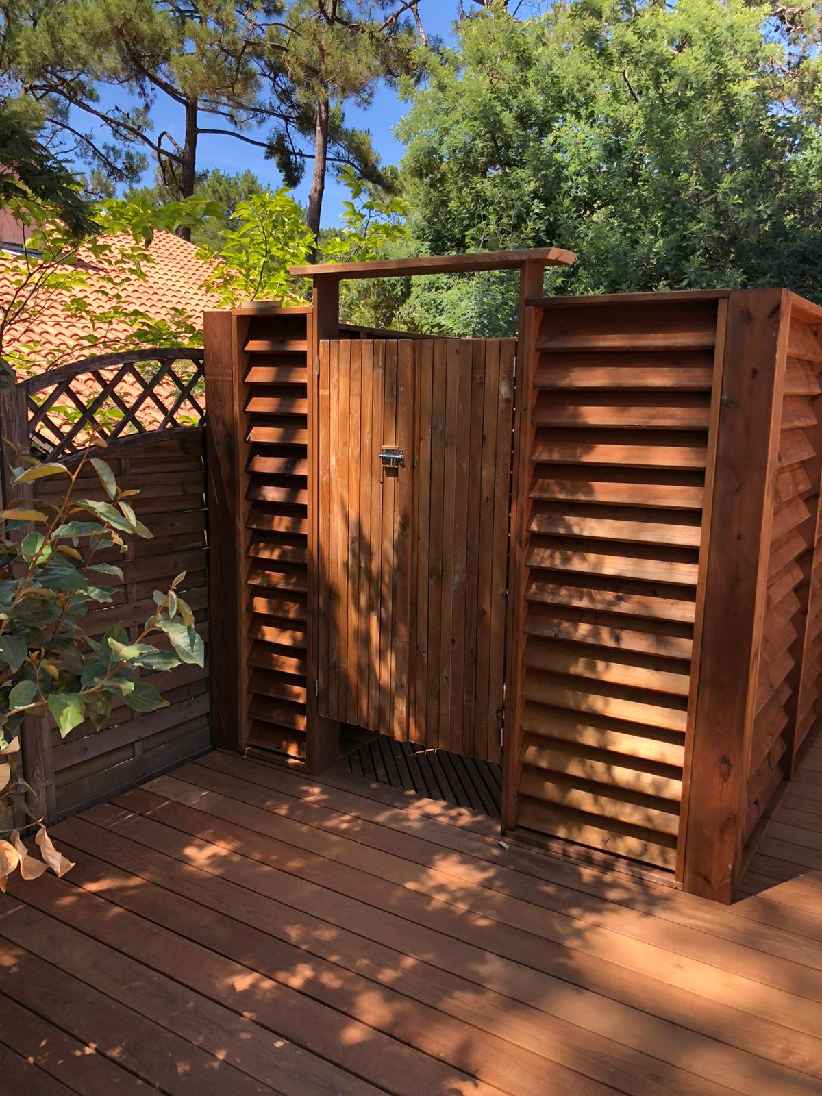 Autour d'une terrasse existante, création d'un nouvel espace plus propice à la détente (agrandissement, douche extérieure, rack de surfs) - Lacanau Océan 33